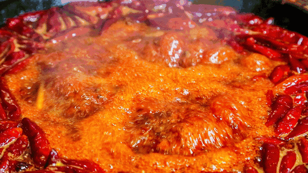 在川鍋一號的車間,我們看到了最重要的炒料環(huán)節(jié)。美鑫食品工廠的的炒鍋是自翻式炒鍋。面前一鍋紅波瀲滟的翻滾,底料的香味被熱浪激發(fā),厚重香醇的鮮牛油下,辣椒、花椒、香料在暗流涌動。