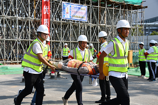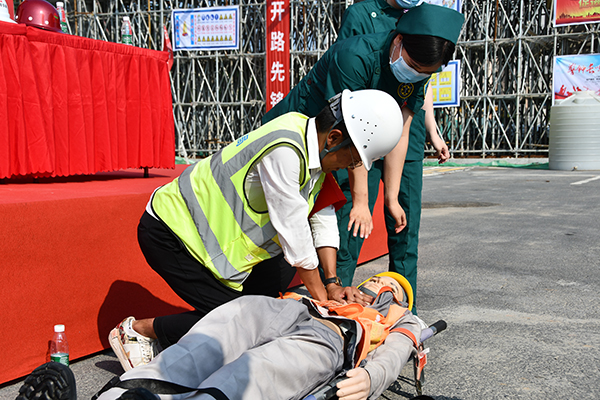本次演練模擬現(xiàn)場1名工人在高空施工作業(yè)過程中不慎從高處墜落。事故發(fā)生后,現(xiàn)場施工人員積極組織自救,同時項目部立即啟動高墜事故應急預案,搶險救援組、現(xiàn)場治安組、醫(yī)療救護組、后勤保障組、調(diào)度聯(lián)絡(luò)組、善后處理組6個小組迅速反應,根據(jù)各自職責和分工開展救援,并聯(lián)合醫(yī)院救援力量,成功處置險情,應急演練活動圓滿完成。應急演練結(jié)束后,項目部邀請醫(yī)生為大家講解搶救人員心肺復蘇急救知識。