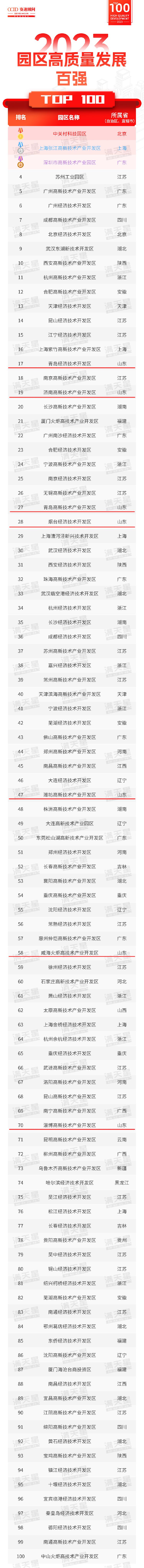 7月5日,賽迪顧問園區(qū)經(jīng)濟(jì)研究中心發(fā)布了《2023園區(qū)高質(zhì)量發(fā)展百強(qiáng)研究報告》(以下簡稱《報告》)。2023園區(qū)高質(zhì)量發(fā)展百強(qiáng)中,國家高新區(qū)占52席,國家級經(jīng)開區(qū)為48席。從區(qū)域?qū)嵙,?0名中,江蘇省占6席,在發(fā)展質(zhì)量和數(shù)量方面保持高位,與廣東。4席)、山東。4席)共同組成園區(qū)百強(qiáng)的“頭部陣營”。