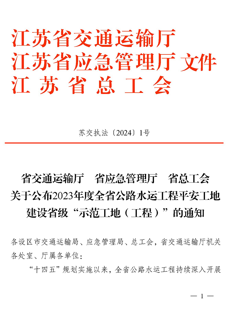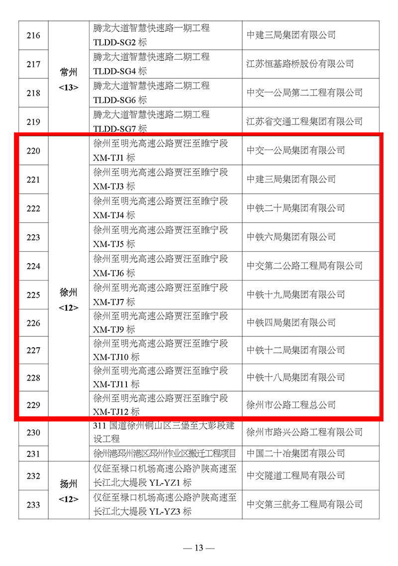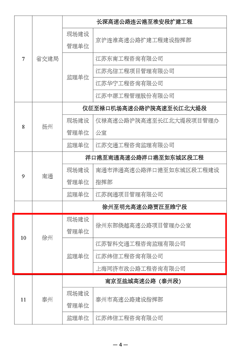 黃淮網(wǎng)(圖/文:趙崢) 2024年1月29日,江蘇省交通廳、江蘇省應(yīng)急管理廳、江蘇省總工會(huì)聯(lián)合印發(fā)《關(guān)于公布2023年度全省公路水運(yùn)工程平安工地建設(shè)省級(jí)“示范工地(工程)”的通知》,徐州東部繞越高速公路(徐州至明光高速公路賈睢段)項(xiàng)目被評(píng)為2023 年度平安工地建設(shè)省級(jí)“示范工程”,本項(xiàng)目全線10個(gè)路基施工標(biāo)段均被評(píng)為2023年度平安工地建設(shè)省級(jí)“示范工地”。