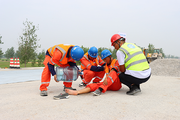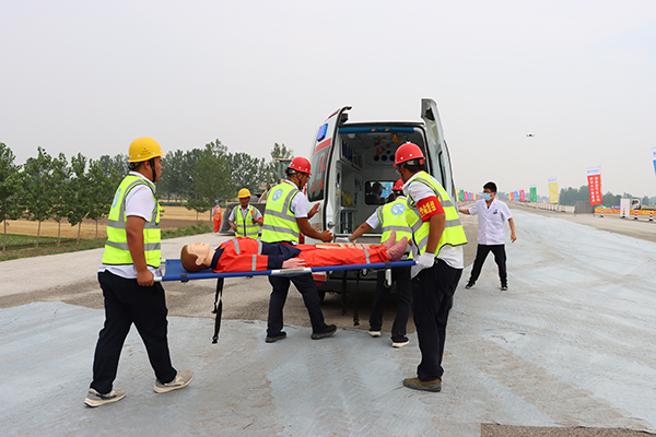 “報(bào)告經(jīng)理,瀝青攤鋪現(xiàn)場(chǎng)一料車傾覆,一名工人被燙傷,司機(jī)被困駕駛室具體情況不明,請(qǐng)指示。”“收到,立即啟動(dòng)應(yīng)急預(yù)案!”事故發(fā)生、啟動(dòng)預(yù)案、力量集結(jié)、人員定位、裝備攜行、編組分隊(duì)、醫(yī)療救護(hù)、搶險(xiǎn)救援……所有環(huán)節(jié)步驟急而不慌、忙而不亂,達(dá)到了預(yù)期效果。