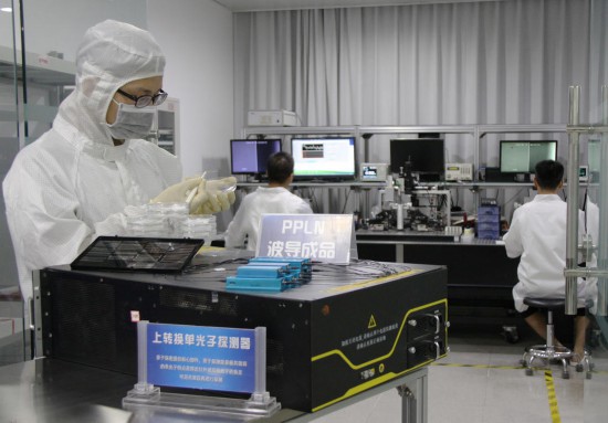 濟(jì)南量子技術(shù)研究院的科研人員,正在檢測(cè)周期極化鈮酸鋰波導(dǎo)芯片。