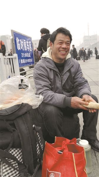睢寧民工西軍吃著家鄉(xiāng)的煎餅等待進(jìn)站。王 巖攝