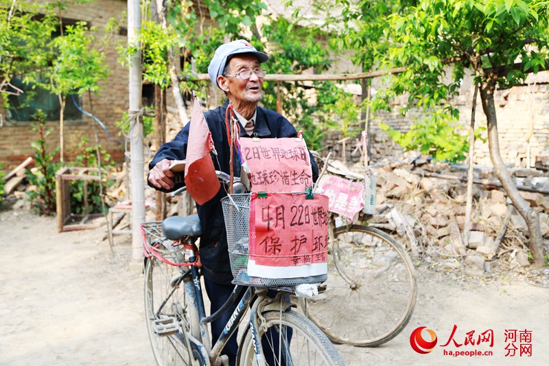人民網(wǎng)鄭州5月5日電(辛靜) 在開封杞縣,提起宋懷然,幾乎無人不知。雖然他只是一位農(nóng)民,卻為宣傳環(huán)保付出了56萬多元,幾乎傾盡家底;盡管他已是一位年近八旬的耄耋老人,卻仍然每天登著自行車走村串巷宣傳他的環(huán)保理念。