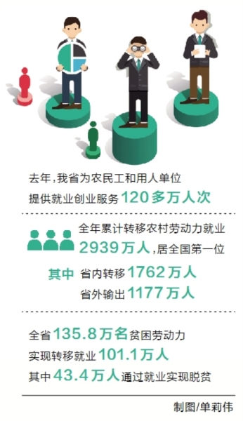 去年,我省為農(nóng)民工和用人單位搭建對(duì)接平臺(tái),提供就業(yè)創(chuàng)業(yè)服務(wù)120多萬(wàn)人次。全年累計(jì)轉(zhuǎn)移農(nóng)村勞動(dòng)力就業(yè)2939萬(wàn)人,居全國(guó)第一位,其中省內(nèi)轉(zhuǎn)移1762萬(wàn)人,省外輸出1177萬(wàn)人。全省135.8萬(wàn)名貧困勞動(dòng)力實(shí)現(xiàn)轉(zhuǎn)移就業(yè)101.1萬(wàn)人,其中43.4萬(wàn)人通過(guò)就業(yè)實(shí)現(xiàn)脫貧。