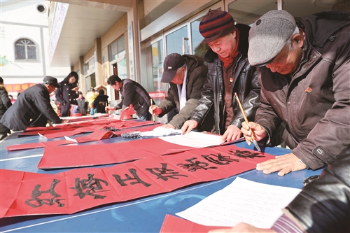 安然村書記金樹強介紹,這天,正為50歲以上村民發(fā)送福利,同時開展安枝古村年味送溫暖民俗活動、2019年寫春聯(lián)送千家活動。