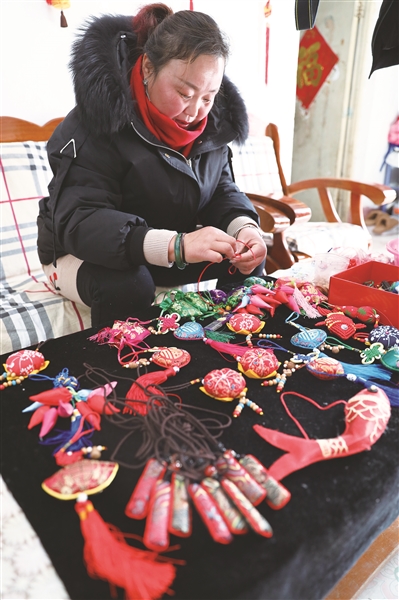 每逢節(jié)假日,就是40歲的戴玲芝的“工作日”。一團七彩棉線、一把剪刀、一包配制好的中草藥,再加上一雙巧手,幾分鐘時間,一個精致的中藥香包便縫制而成,博得村民們陣陣贊嘆。