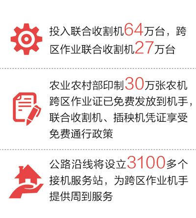 跨區(qū)作業(yè)綠燈開(kāi)放。農(nóng)業(yè)農(nóng)村部印制30萬(wàn)張農(nóng)機(jī)跨區(qū)作業(yè)證已免費(fèi)發(fā)放到機(jī)手,聯(lián)合收割機(jī)、插秧機(jī)憑證享受免費(fèi)通行政策。公路沿線將設(shè)立3100多個(gè)接機(jī)服務(wù)站,為跨區(qū)作業(yè)機(jī)手提供周到服務(wù)。