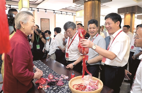 在馬莊香包大院,代表們對(duì)王秀英老人的香包作品贊不絕口。 徐報(bào)融媒記者 齊浩 攝
