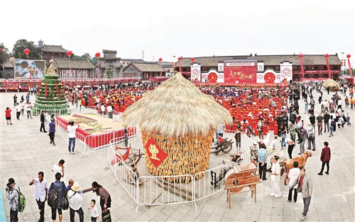 用五谷雜糧擺成的巨幅“大豐收”字樣,高高的谷垛上堆滿了南瓜、土豆、茄子等豐收的“成果”,茅草房的外墻掛滿了金燦燦的玉米……豐收,讓來慶祝自己節(jié)日的農(nóng)民們,臉上寫滿了驕傲。