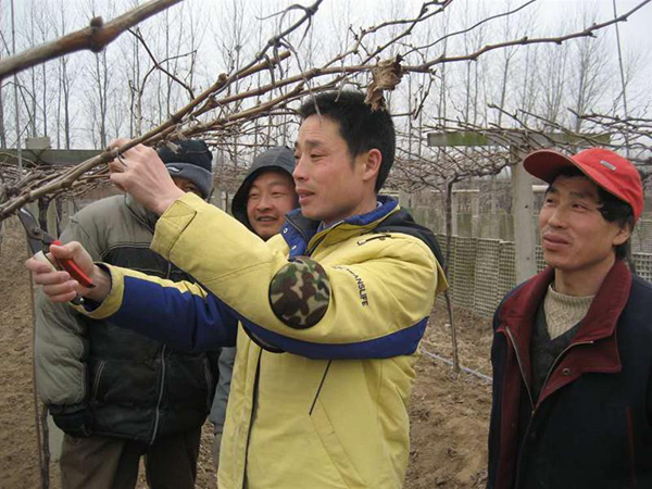 經過“選秀”,繆世宏把“夏黑”“美人指”“徐香蜜”“陽光玫瑰”等幾個優(yōu)質品種推薦給農戶。他還對困難戶進行義務幫扶,先免費提供葡萄苗,待收益后再付款,免費教葡萄種植技術。為了讓更多的種植戶掌握技術要領,繆世宏主動帶領他們定期到自家葡萄園里實踐操作,他每年都現(xiàn)場解答種植戶在管理過程中遇到的各種疑難問題,定期不定期地進行技術培訓,上門進行技術服務,還專門在自家騰出一間房子,將自己訂閱的所有資料擺上書架,讓種植戶隨時免費學習。此外,他還聯(lián)合銅山區(qū)林業(yè)局編印了《葡萄種植100問》等宣傳材料,免費送給果農學習參考。