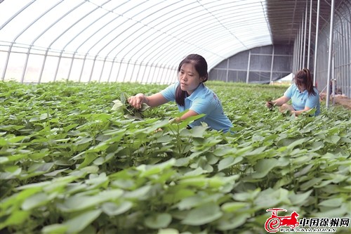 在賈汪區(qū)回鄉(xiāng)人才袁起建設(shè)的甘薯產(chǎn)業(yè)園大棚里,工人在摘采食用的甘薯芽。
