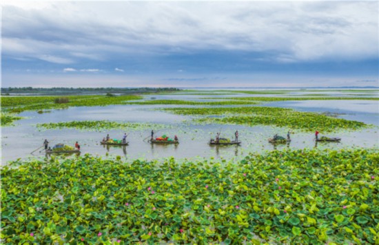 宿遷市泗洪縣臨淮鎮(zhèn)退捕漁民轉(zhuǎn)產(chǎn)就業(yè),做起了荷花、荷葉生意。
