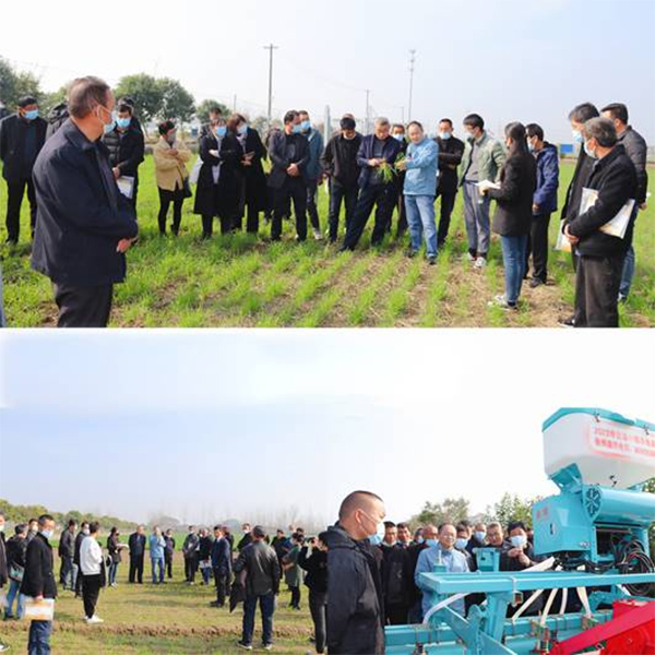 與會(huì)人員實(shí)地觀摩了綜合示范基地品種示范展示與推介篩選田、高產(chǎn)攻關(guān)田及5個(gè)不同播期播量試驗(yàn)示范、淮北地區(qū)稻茬小麥緩釋肥減施增效模式示范試驗(yàn)、不同耕作方式對(duì)小麥苗情素質(zhì)和小麥病蟲草害的影響試驗(yàn),以及長期秸稈還田下肥料合理減施對(duì)小麥綜合生產(chǎn)力的影響試驗(yàn)苗情長勢(shì),實(shí)地感受智能精量播種機(jī)的播種質(zhì)量及適時(shí)適墑適量播種的壯苗效果,切實(shí)體會(huì)“高標(biāo)準(zhǔn)整地、藥劑拌種、適墑?chuàng)尣、適期適量機(jī)械精播、播后鎮(zhèn)壓、三溝配套”等技術(shù)應(yīng)用效果。
