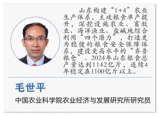 山東扛牢農(nóng)業(yè)大省、糧食大省責(zé)任,樹立大農(nóng)業(yè)觀、大食物觀,構(gòu)建“1+4”農(nóng)業(yè)生產(chǎn)體系,主攻糧食單產(chǎn)提升,深挖設(shè)施農(nóng)業(yè)、畜牧業(yè)、海洋漁業(yè)、鹽堿地綜合利用“四個(gè)潛力”,打造更為穩(wěn)健的糧食安全保障體系,建設(shè)更高水平的“齊魯糧倉”。2024年山東糧食總產(chǎn)量達(dá)到1142億斤,連續(xù)4年穩(wěn)定在1100億斤以上。