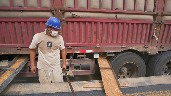 運(yùn)糧車正在卸小麥。人民網(wǎng)記者 王天樂攝