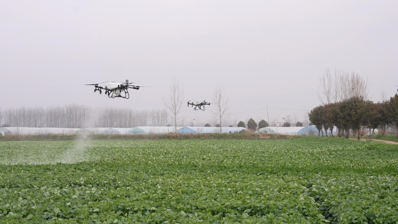 農(nóng)用無(wú)人機(jī)正在開(kāi)展噴藥、施肥作業(yè)。固始縣委宣傳部供圖