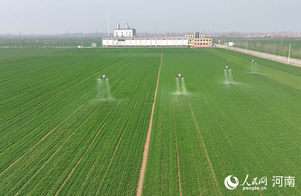 夏邑縣植保無人機開展飛防作業(yè),高效噴施藥劑,助力穩(wěn)產(chǎn)增收。人民網(wǎng)記者 尚明楨攝