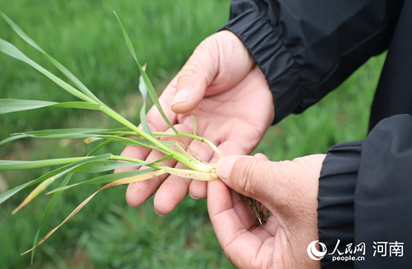 夏邑縣農(nóng)技人員手中的小麥植株分蘗健壯,顯示出良好的春管基礎。人民網(wǎng)記者 辛靜攝