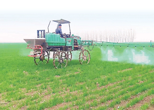 3月5日,河南省漯河市舞陽(yáng)縣田園先鋒種植合作社的麥田里正在進(jìn)行“一噴三防”作業(yè)。 資料圖