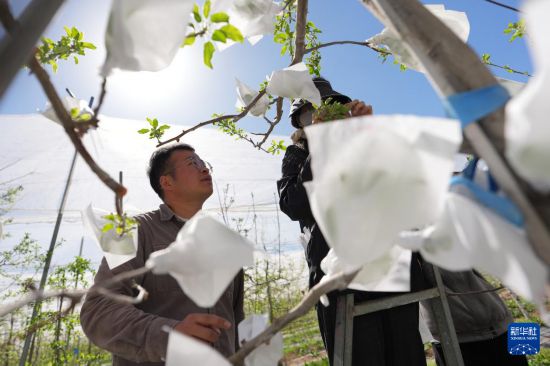 4月10日,在延安洛川蘋果試驗(yàn)示范站科技小院的試驗(yàn)田里,西北農(nóng)林科技大學(xué)博士研究生魏江彤在指導(dǎo)碩士研究生做蘋果雜交授粉。