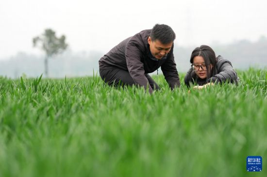 4月8日,陜西隴縣小麥科技小院負(fù)責(zé)人、西北農(nóng)林科技大學(xué)副教授張超(左)和碩士研究生張玉珍在試驗(yàn)田里查看小麥生長情況。