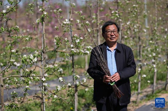 4月10日,延安洛川蘋果試驗(yàn)示范站科技小院首席專家、西北農(nóng)林科技大學(xué)教授馬鋒旺在蘋果園里手捧“秦脆”蘋果嫁接枝條。