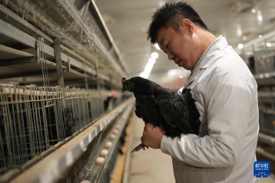 4月9日,西北農(nóng)林科技大學(xué)博士研究生秦凱龍?jiān)陉兾魑涔仪菘萍夹≡吼B(yǎng)殖區(qū)內(nèi)查看略陽烏雞雜交后代成長情況。