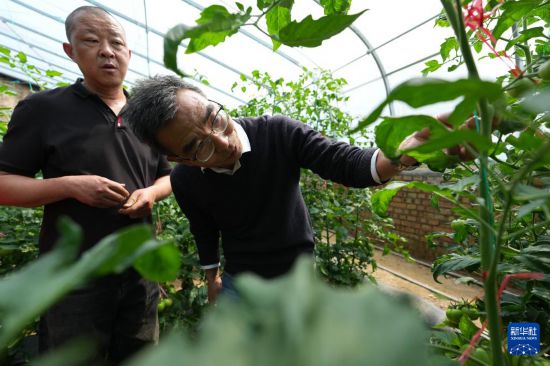 4月9日,陜西涇陽蔬菜科技小院首席專家、西北農(nóng)林科技大學(xué)推廣研究員張明科(右)在涇陽縣三渠鎮(zhèn)白楊村菜農(nóng)張東闖的蔬菜大棚內(nèi)查看西紅柿生長情況。