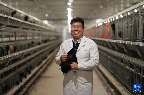 4月9日,西北農(nóng)林科技大學(xué)博士研究生秦凱龍?jiān)陉兾魑涔仪菘萍夹≡吼B(yǎng)殖區(qū)內(nèi)手捧略陽烏雞雜交后代。