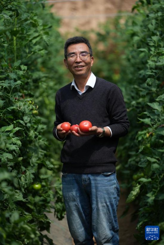 4月9日,陜西涇陽蔬菜科技小院首席專家、西北農(nóng)林科技大學(xué)推廣研究員張明科手捧普羅旺斯西紅柿站在蔬菜大棚里。