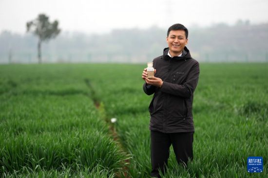 4月8日,陜西隴縣小麥科技小院負(fù)責(zé)人、西北農(nóng)林科技大學(xué)副教授張超手捧西農(nóng)111小麥種子站在試驗(yàn)田里。
