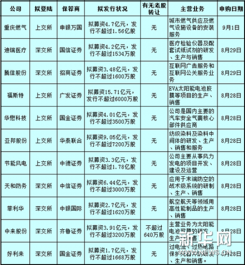 從申購(gòu)日期來(lái)看,8月28日有8家新股申購(gòu),分別是福斯特、華懋科技、亞邦股份、節(jié)能風(fēng)電、天和防務(wù)、菲利華、中來(lái)股份和好利來(lái),成為最集中的一天。迪瑞醫(yī)療和騰新股份分別于8月29日申購(gòu),重慶燃?xì)庥?月1日申購(gòu)。