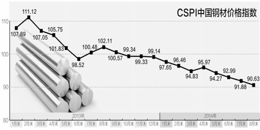 跌,又跌,還在跌!進(jìn)入2014年,鋼材價(jià)格下跌態(tài)勢(shì)依舊穩(wěn)固。上半年,重點(diǎn)統(tǒng)計(jì)鋼企的鋼材銷售結(jié)算價(jià)格降至3212元/噸,相當(dāng)于每斤1.6元,與超市白菜價(jià)格相差無幾;8月末,鋼鐵協(xié)會(huì)鋼材綜合價(jià)格指數(shù)已跌至90.63點(diǎn),為2003年6月以來的最低水平。