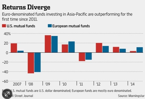 根據(jù)晨星基金的統(tǒng)計,今年以美元為主導的共同基金在亞洲股市的整體收益率只有3.2%,遠低于大多數(shù)歐元型共同基金11.2%的收益表現(xiàn)。