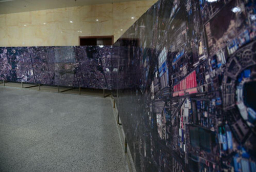 公司一層大廳里,一組北京市衛(wèi)星地圖引起我們的興趣,圖片上清晰可見鳥巢、國家大劇院、故宮等標(biāo)志性建筑。照片正是位于地球650公里以外的“吉林一號(hào)”傳回的圖像。