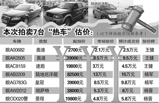 作為國家注冊舊機動車鑒定估價師,安徽幫幫二手車公司負責(zé)人王健常年為市民做二手車評估服務(wù)。“為了吸引市民參加,起拍價肯定會比較低,所以溢價率超出100%很正常。”比如,對本次關(guān)注度較高起拍價為3.9萬元的皖A(yù)K0505奧迪A6車,他的估價就達到8.5萬元,超出底價一倍多。