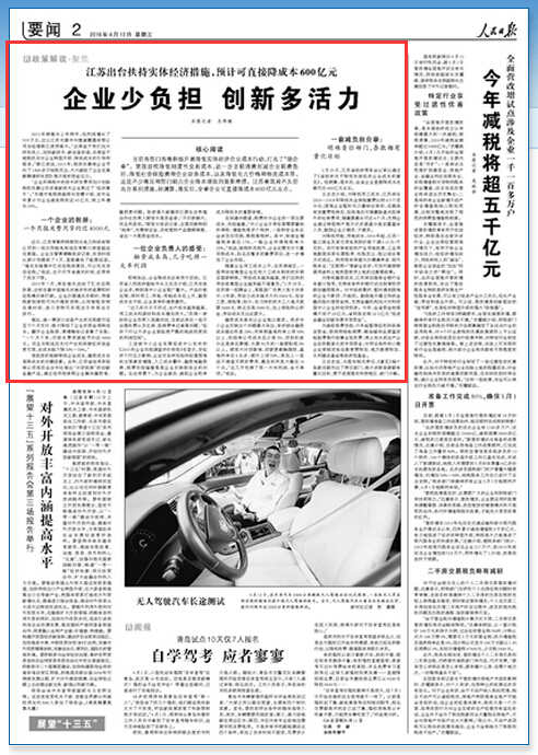 人民日?qǐng)?bào):江蘇出系列措施助企業(yè)降低成本600億