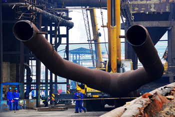 施工人員對河北霸州市新利鋼鐵公司的450立方米高爐進(jìn)行拆除。新華社發(fā)(金志超攝)