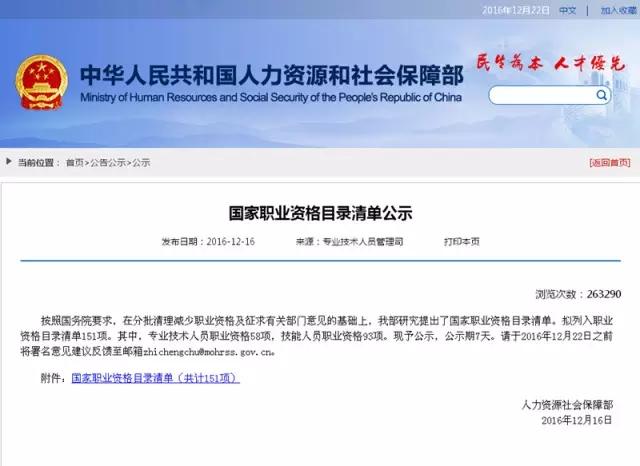 2016年12月16日,人力資源和社會(huì)保障部公示了國(guó)家職業(yè)資格目錄清單,擬列入職業(yè)資格目錄清單151項(xiàng)。其中,專業(yè)技術(shù)人員職業(yè)資格58項(xiàng),技能人員職業(yè)資格93項(xiàng)。