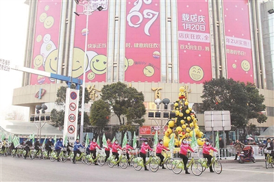 寒風陣陣,彩旗獵獵。2016年12月31日上午八點整,中央百大門前,9個員工方陣早已列隊完畢,數(shù)百人精神抖擻,斗志昂揚,滿懷激情地迎來了“贏戰(zhàn)2017——67周年店慶誓師大會”,咚咚的戰(zhàn)鼓,沖天的口號,不斷變換的創(chuàng)意造型,熱情洋溢的快閃舞蹈,充滿莊嚴使命感的任務下達,令人血脈沸騰的集體宣誓,讓這個嚴冬的早晨不再寒冷,而變得火力四射,暖意融融。大會結(jié)束后,近百人組成的綠色環(huán)保自行車隊還進行了環(huán)城公益騎行,向市民派發(fā)防霧霾口罩,在展示員工風采的同時,也彰顯了百大一直以來的強烈社會責任感。