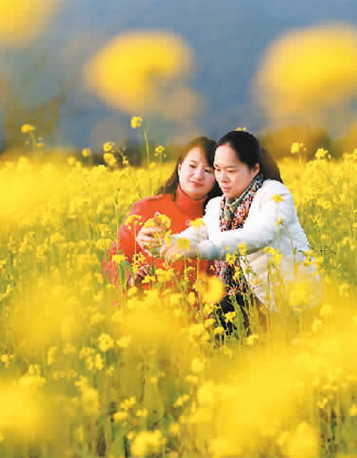 游客在江西省峽江縣金坪民族鄉(xiāng)油菜花地里拍照。