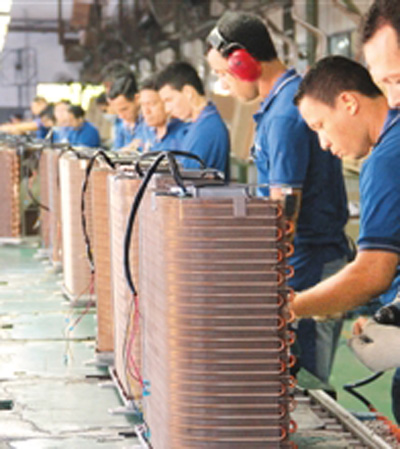 在巴西瑪瑙斯自貿(mào)區(qū)的格力空調(diào)廠房?jī)?nèi),工人們正在工作。