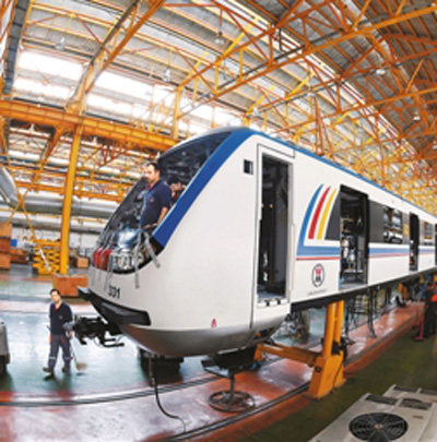 2016年9月4日,在伊朗德黑蘭,工人在組裝廠內(nèi)組裝軌道車輛。德黑蘭5條地鐵線全部由中國(guó)公司承建。