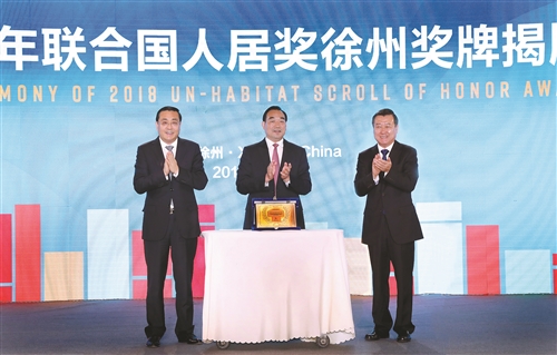 倪虹、費(fèi)高云、周鐵根共同為2018『聯(lián)合國人居獎』徐州獎牌揭牌。