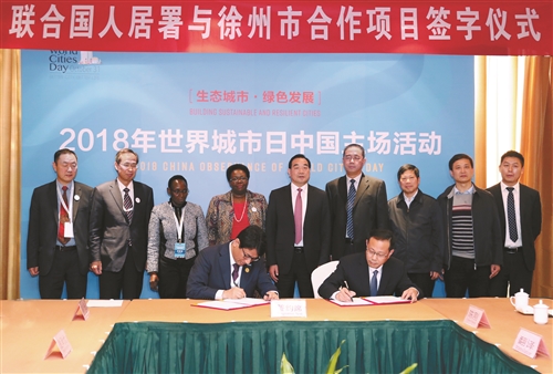 聯(lián)合國(guó)人居署與徐州市合作項(xiàng)目簽字儀式。 徐州日?qǐng)?bào)全媒體記者 徐劍 齊浩 攝