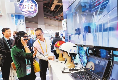 11月5日,一名參觀者(左)在諾基亞展臺體驗一款基于5G通信技術(shù)的AR安防系統(tǒng)終端設(shè)備。新華社發(fā)