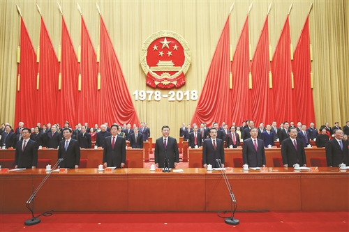 人民大會堂雄偉莊嚴,萬人大禮堂燈火輝煌、氣氛熱烈。主席臺上方懸掛著“慶祝改革開放40周年大會”會標,后幕正中是中華人民共和國國徽和“1978-2018”字標,10面紅旗分列兩側(cè)。