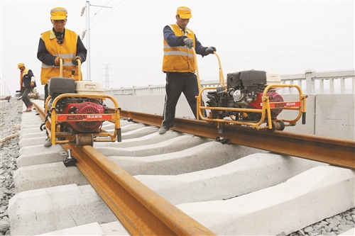 “我們加班加點(diǎn)開(kāi)展鋪軌施工,搶工期、趕進(jìn)度,有時(shí)夜間也組織施工,確保4月底完成正線(xiàn)鋪軌任務(wù)。7月份可進(jìn)行靜態(tài)驗(yàn)收,9月進(jìn)行聯(lián)調(diào)聯(lián)試,2019年底達(dá)到通車(chē)運(yùn)營(yíng)條件。”中鐵十一局集團(tuán)徐宿淮鹽鐵路五標(biāo)項(xiàng)目黨工委書(shū)記蒲旺介紹,睢寧站至觀音站36公里僅用了22天完成雙線(xiàn)鋪設(shè)。