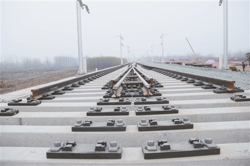 睢寧境內(nèi)鋪設(shè)鐵軌。 徐州日?qǐng)?bào)全媒體記者 楊旭東 通訊員 郭愛(ài)華 呂立鵬 攝
